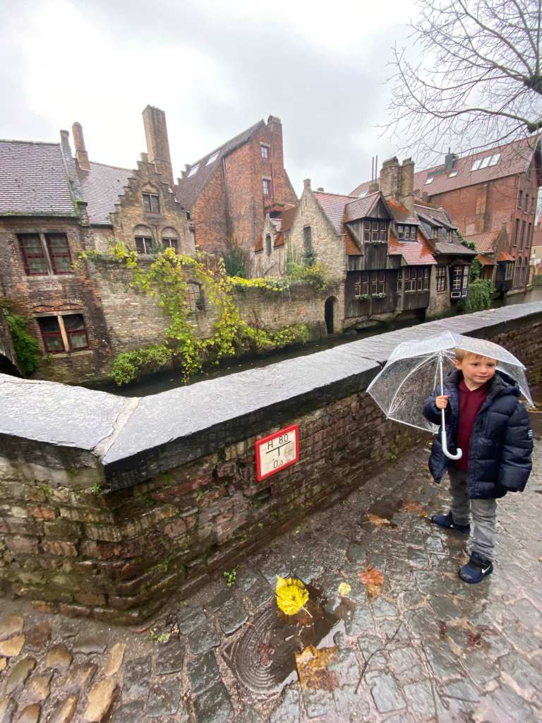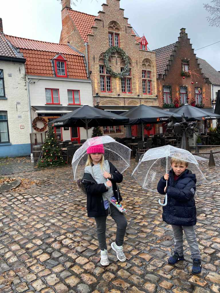 The best thing to do in Bruges is walk around the city and explore! There is beauty around every corner. When I was in my 20s I visited Bruges and took a canal boat tour, but since we just did that in Amsterdam and it was raining and cold, we opted for walking this time. Waterproof shoes and clear domed umbrellas for the kids kept everyone comfortable in the rain and cold.